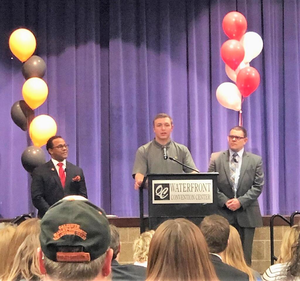 On Wednesday, April 20th, three PV students participated in the Quad Cities High School Apprenticeship Signing Day: Clayton Shelton, Jacob Staszewski and Aidan Thoene. Clayton and Aidan, seniors at the high school began their apprenticeship in January. Jacob, a junior, will begin his apprenticeship in June. All three students are CNC Machinist Apprentices at Arconic. Connor Wipperfurth, a senior, is a second year apprentice at John Deere. He was invited to speak to the audience to give a student's perspective.