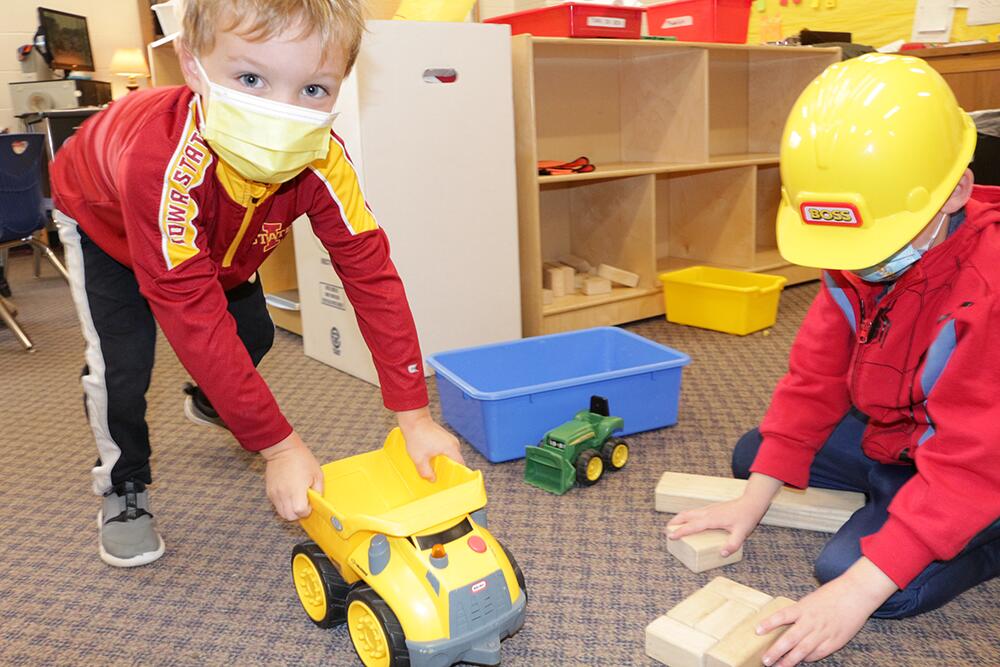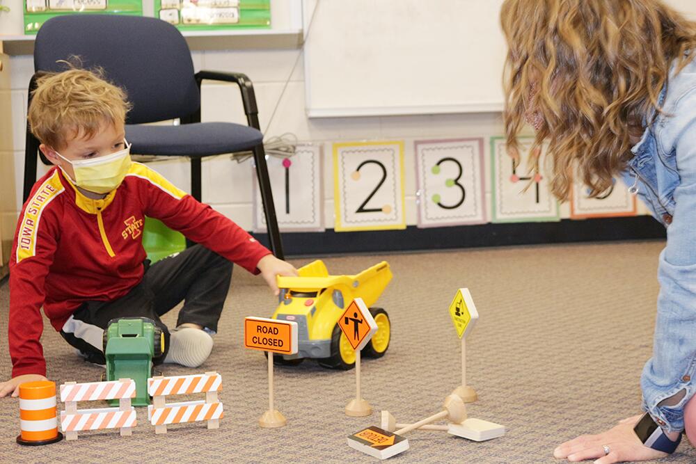 In our Transition to Kindergarten class, learning through play is so important. They're learning about signs right now - that they mean something and it's likely you need to pay attention when you see one. Playing with construction toys allows these young ones to see when they might need a slow sign or when a sign might need to go up to warn others that workers are on the scene.