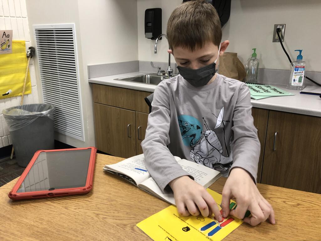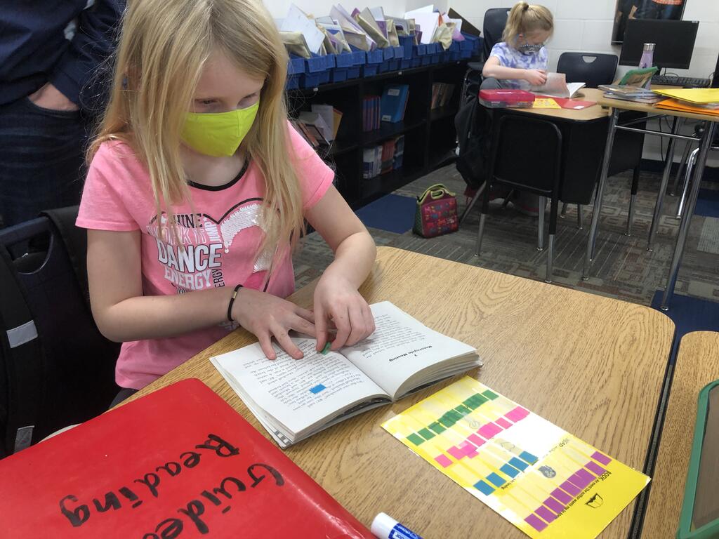 In Mr. Fermoyle’s 3rd grade class at Cody, we got a glimpse of some hard work through guided reading. Students are assigned different books at their own reading level and work with the teacher – in this case in a slide show – to show their fluency and comprehension. Students mark the books with tons of post-its indicating different categories, like an event the author wants me to know or feelings or motivations a character is having. This helps students read deeper and retain more.